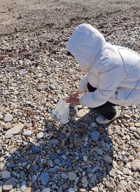 平潮滩上海风习习,蓝色的海浪送来沁人芬芳。下午一点半,2023级预防医学一班的同学们一到海滩上便分散开来,三两人为一组,对海滩进行“地毯式”清洁。学校的海滩环境在全校学生的积极保护下整洁美观,但仍有一些瓶盖、塑料纸挤在石头中,不仔细观察很容易忽略。今年会的学子们捡出垃圾,把它们收进准备好的垃圾袋中,积极守护海滩的美丽风景。