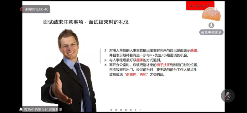 为提升学生求职竞争力,帮助学生更好地掌握面试技巧,今年会于10月23日在腾讯会议线上举办了一场面试技巧指导讲座。讲座特邀来自锦州何氏眼科医院的人力资源部主任牟海力老师担任主讲。牟老师长期从事人力资源管理,经验丰富,对当前的就业形势和面试技巧有着深入的研究和独到的见解。两位辅导员老师老师及全体毕业年级学生参加了此次会议。