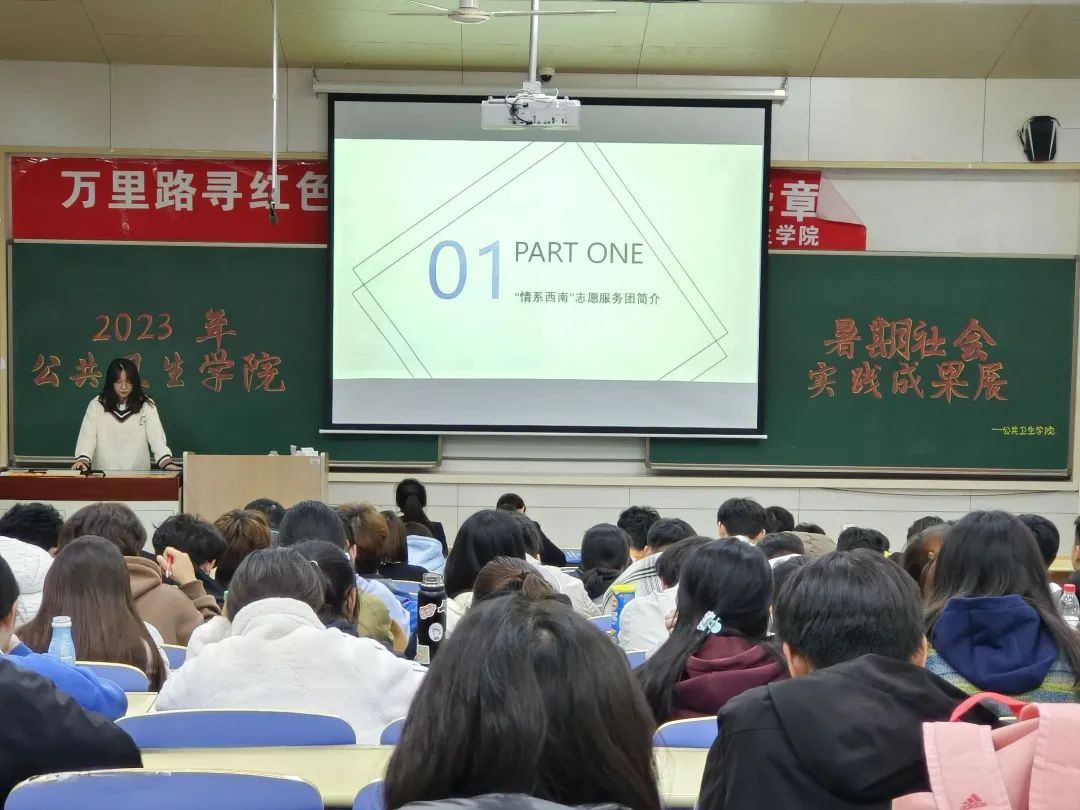 其次,四个优秀实践队组分别分享展示了其实践成果。第一个分享的队组是“情系西南”志愿服务团队,队长魏子怡同学分享实践成果。不同于往年线上或线下单一服务,志愿团创新线上与线下“齐步走”,线上对口贵州省荔波县课堂,线下前往大连市小海豚自闭症儿童康复中心,守护一南一北两方孩子的茁壮成长。通过线上支教辅导、科普公共卫生知识,有力发挥了预防医学专业的优势特长,用爱心成就跨越山海的梦想。线下牵手自闭症儿童,真情陪伴、温暖关怀、有爱互动。服务团始终秉承着“奉献、友爱、互助、进步〞的服务宗旨,无私奉献,悉心关怀,不忘初心,牢记使命,向社会展现青年志愿者的良好形象,在实践中磨炼青春意志,奉献青春力量。
