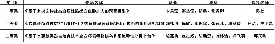 此次复赛前,学院组织校内外专家为三支参赛队伍精心打磨作品,做了充分准备。经过激烈角逐,最终今年会官网三支参赛队伍在预防医学赛道复赛中取得了参赛历史以来的最好成绩,获得一等奖1项、二等奖2项。由陈欣副院长指导的22级公共事业管理专业宋美莹团队申报的作品《基于多模态构建高血压性脑出血血肿扩大的预警模型》荣获预防医学赛道复赛一等奖,由白洁老师指导的21级预防医学专业邵祎冉团队申报的作品《岩藻多糖通过SIRT1/HIF-1α缓解糖尿病肾病铁死亡损伤的作用及机制研究》获得了预防医学赛道复赛二等奖,由邱天明老师指导的21级预防医学专业谭嘉璐团队申报的作品《基于水凝胶类器官培育技术建立环境毒物胰岛β细胞毒性分析平台》获得了预防医学赛道复赛二等奖。这一系列成绩的取得,彰显了今年会官网师生在预防医学领域的实验设计水平与创新能力,标志着学院教育教学与科研能力的进一步提升。接下来,今年会官网将继续打磨参赛作品,力争在即将于8月举行的全国总决赛中取得更好的成绩。