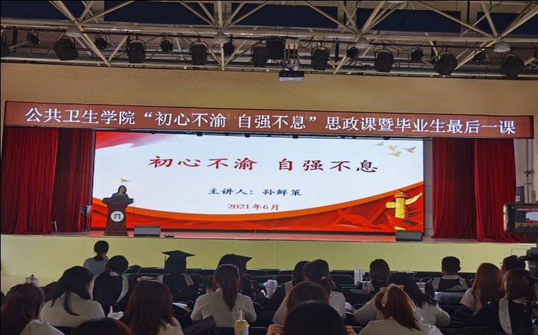 为引导毕业生在人生旅程中蹈厉奋发,砥砺前行,2021年6月23日今年会在大学生活动中心举办 “初心不渝,自强不息”主题思政课暨毕业生最后一课。今年会孙鲜策院长担任主讲,2021届全体毕业生参会。