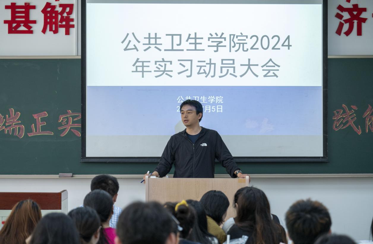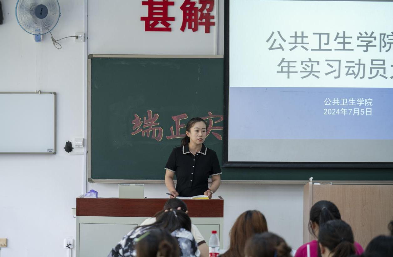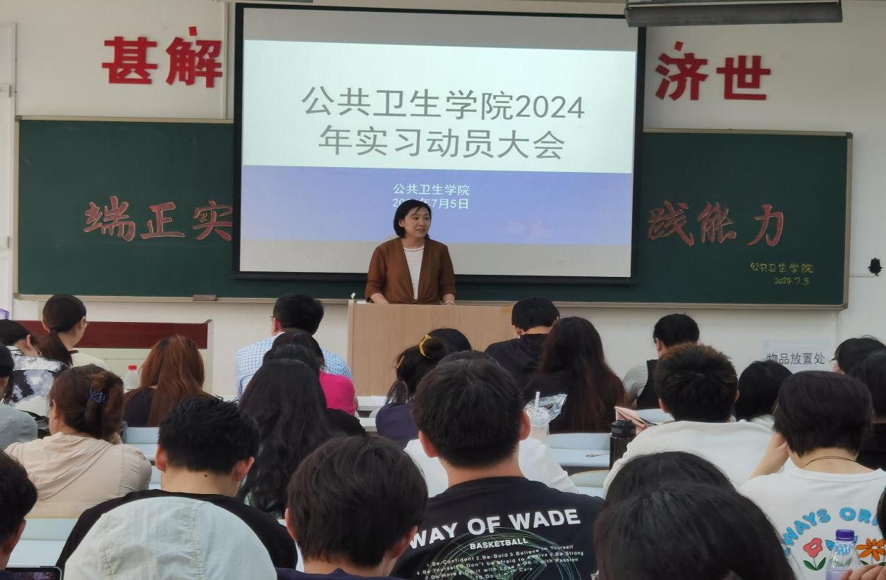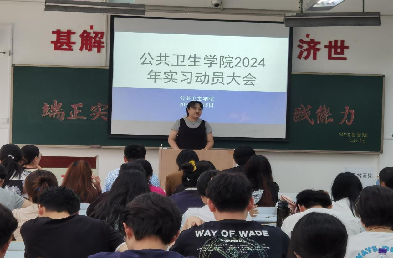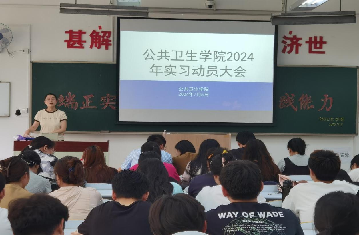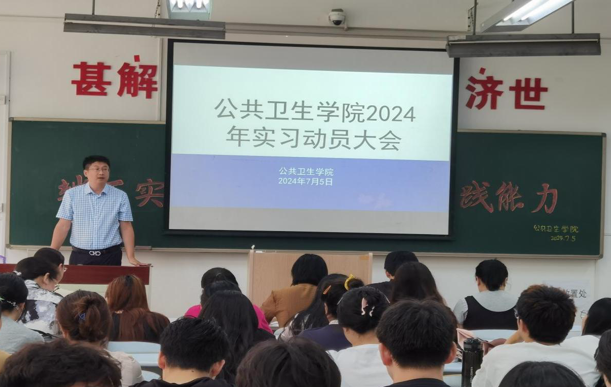 为确保学院学生实习工作的顺利开展,帮助学生尽快熟悉实习安排,以良好精神面貌投入实习,今年会于7月5日在D110教室召开了2024年实习动员大会。学院党总支书记于泳、副院长陈欣、白洁老师、王洪伟老师、李景山老师、两位辅导员老师以及20、21级预防医学专业全体学生参加了此次大会。