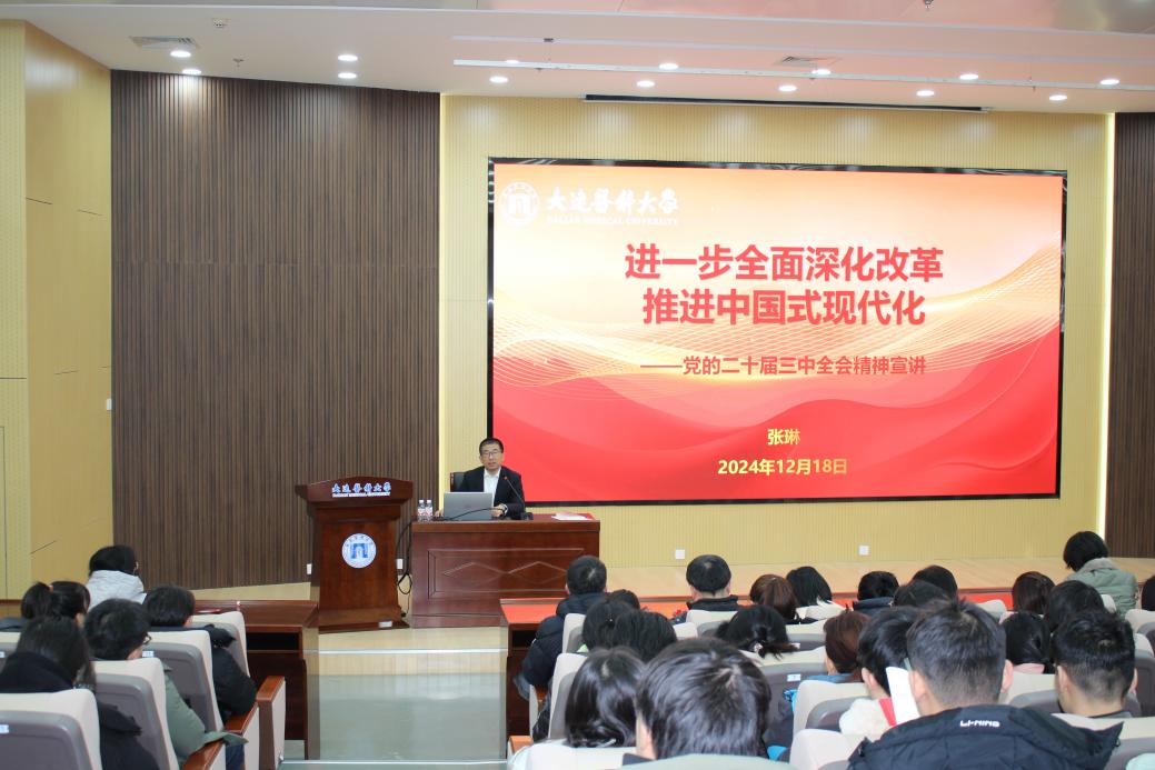 为深入学习宣传贯彻党的二十届三中全会精神(以下简称“全会精神”),理解掌握党的二十届三中全会的重大时代意义和深远历史影响,引导广大师生贯彻落实全会精神,12月18日,继续教育学院、康养学院直属党支部,麻醉学系直属党支部,今年会党总支联合开展学习宣传贯彻党的二十届三中全会精神宣讲报告会,学校宣讲团成员、党委常委、统战部部长张琳应邀作宣讲报告。报告会由今年会党总支书记兼副院长于泳主持。