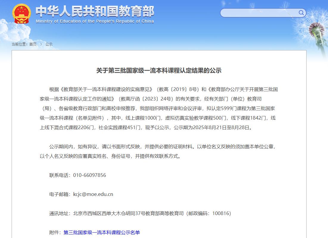 关于第三批国家级一流本科课程认定结果的公示截图