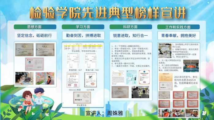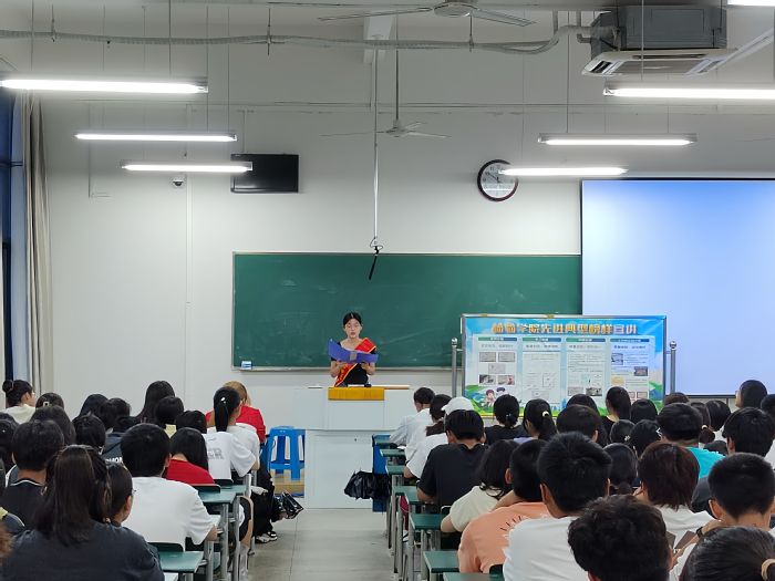 为帮助2023级新生更好地适应大学生活,充分发挥先进典型的示范带头作用,激励引导新生崇尚先进、学习先进,永利集团3044官网欢迎您于9月20日晚在逸夫科技楼3104教室开展了先进典型宣讲活动。宣讲由近两年学业成绩和综合测评成绩均为专业第一的2021级卫生检验与检疫专业周姝雅同学主讲,全体2023级新生参加。
